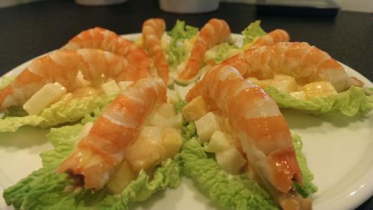 材料:梨瓜1个,虾10只,黄瓜1根,胡萝卜1根,沙拉酱适量。